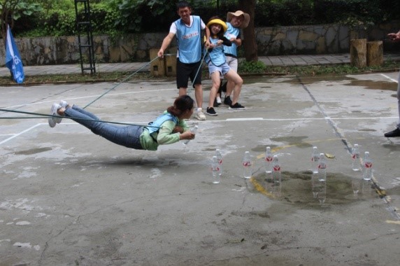 在“動(dòng)力圈”項(xiàng)目中,團(tuán)隊(duì)的39名成員圍坐成一個(gè)面向圓心的大圓,每個(gè)人都雙手握緊繩子,在教練的指令下,全部成員雙手依次向左、上、右、下做畫圓動(dòng)作。這個(gè)看似簡(jiǎn)單的動(dòng)作實(shí)則需要團(tuán)隊(duì)中每個(gè)人的全力以赴,若一個(gè)人松開手臂,那么這個(gè)圓將失去平衡,很難繼續(xù)保持動(dòng)力。為了完成團(tuán)隊(duì)888圈的總目標(biāo),有的成員手掌磨出了血泡,有的成員雙臂酸痛不已,在最后數(shù)到888時(shí),大家發(fā)出一聲聲慨嘆,想必這是竭盡全力、突破自我后的一絲放松。在這個(gè)項(xiàng)目中,但凡有一人支撐不下去,團(tuán)隊(duì)都不可能成功,這不僅是個(gè)人的勝利,也為團(tuán)隊(duì)樹立了迎接挑戰(zhàn)的信心!