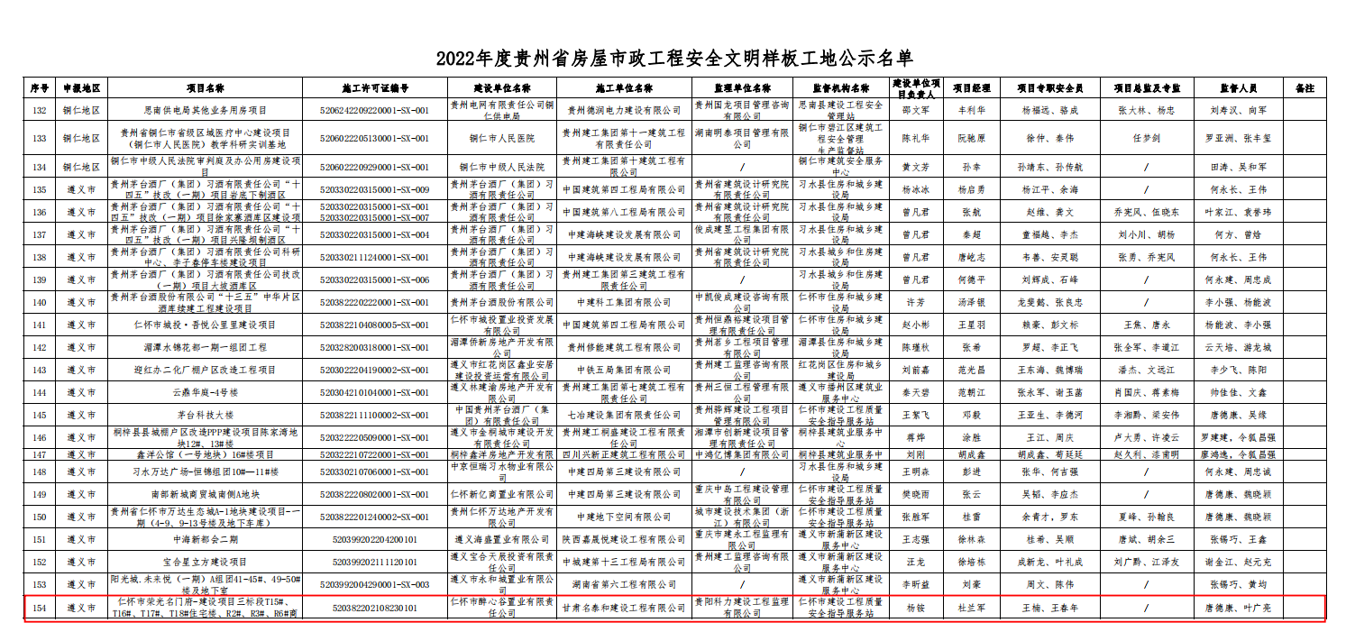 2022年12月24日,從貴州省建筑業(yè)協(xié)會傳來喜訊:由甘肅名泰和建設工程有限公司仁懷分公司承建的榮光·名門府項目,榮獲“2022年度貴州省房屋市政工程安全文明樣板工地”榮譽稱號。